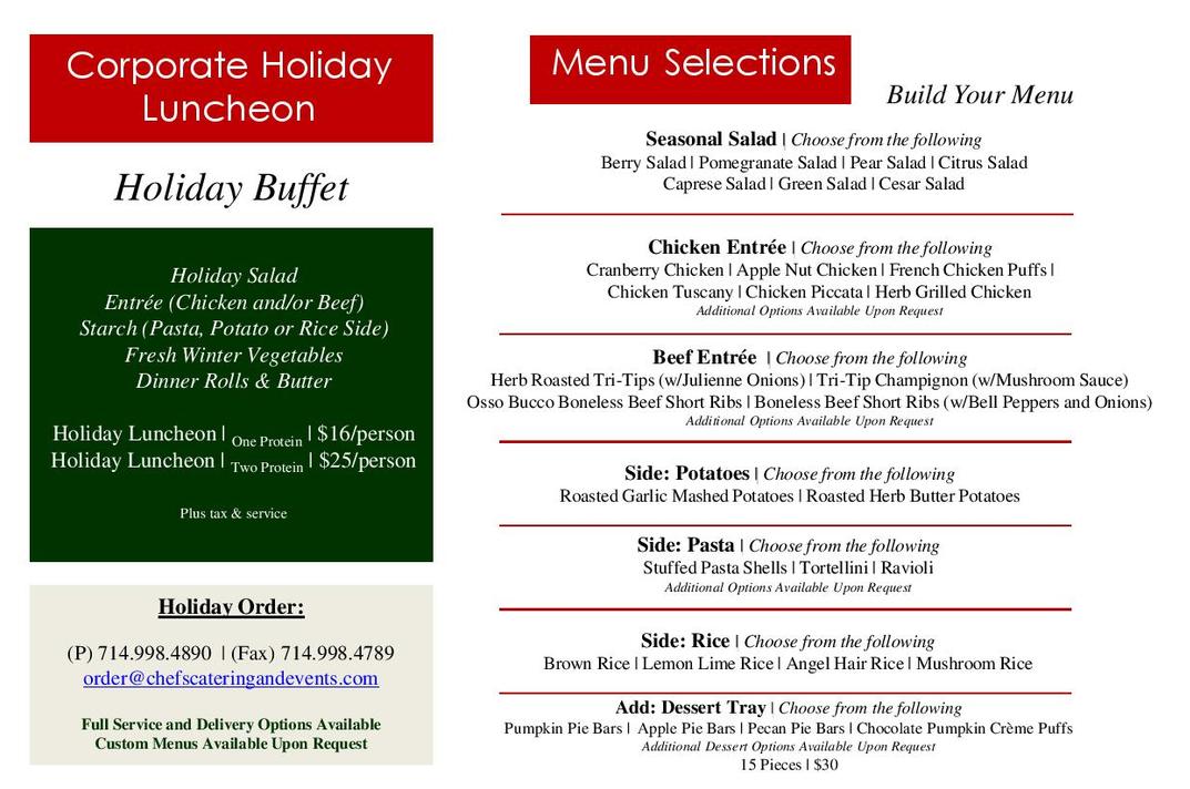 Hoping for a buffet? Done. Need tray passed appetizers? Easy! Hoping to have a prime rib station? We've got you covered. If you need specific ideas on what to order for your holiday party, scroll down to view our Holiday Menu. But remember, we do create custom menus, so please call us if you would like for us to send you a proposal.